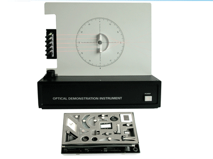激光光学演示仪是一种精典的教学仪器。本仪器采用氦-氖激光光源,光线经柱面透镜扩束后成扇形光束,在演示屏上显示出光线经迹,可演示近几十种几何光学和物理光学实验,图象清晰,生动直观,可在教室里演示实验,不需暗室。